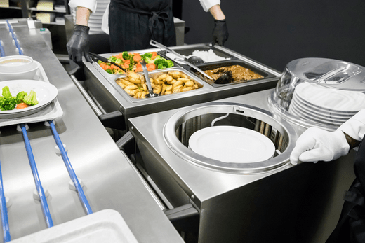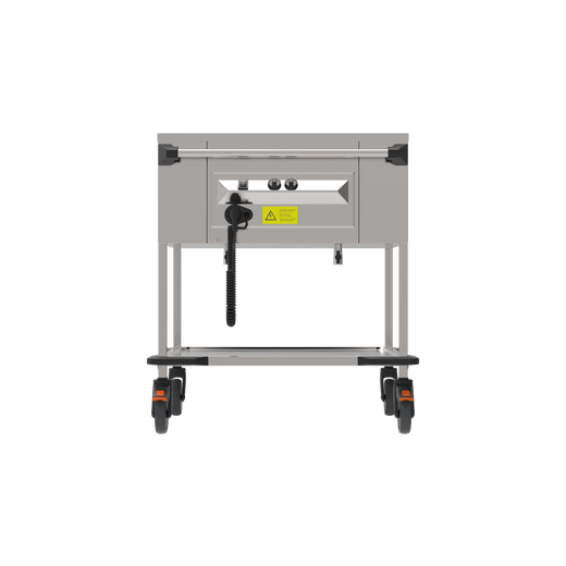 The delivery trolley made of stainless steel with 2 deep-drawn GN 1/1 heated wells on top, wet and dry heating, insulated on all sides, with a welded stainless steel shelf at the bottom - stainless steel castors, 2 swivel castors and 2 swivel castors with brakes.