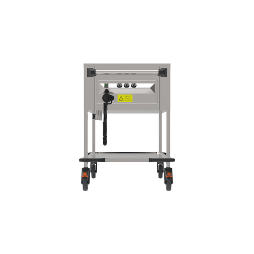 The delivery trolley made of stainless steel with 3 deep-drawn GN 1/1 heated wells on top, wet and dry heating, insulated on all sides, with a welded stainless steel shelf at the bottom - stainless steel castors, 2 swivel castors and 2 swivel castors with brakes.