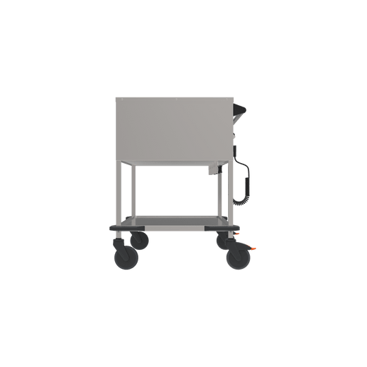The delivery trolley made of stainless steel with 4 deep-drawn GN 1/1 heated wells on top, wet and dry heating, insulated on all sides, with a welded stainless steel shelf at the bottom - stainless steel castors, 2 swivel castors and 2 swivel castors with brakes.